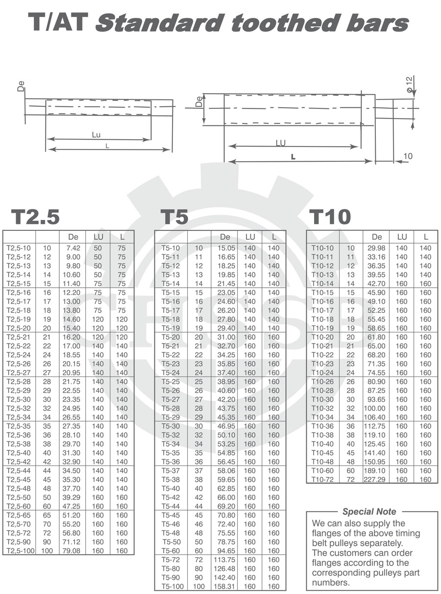 產(chǎn)品范圍: 美標(biāo)/歐標(biāo):(T2.5/T5/T10) 英制尺寸產(chǎn)品(適用于美標(biāo)市場) 公制尺寸產(chǎn)品(適用于歐標(biāo)市場) T/AT齒棒、圓弧齒、STD同步帶輪、圓弧齒齒棒