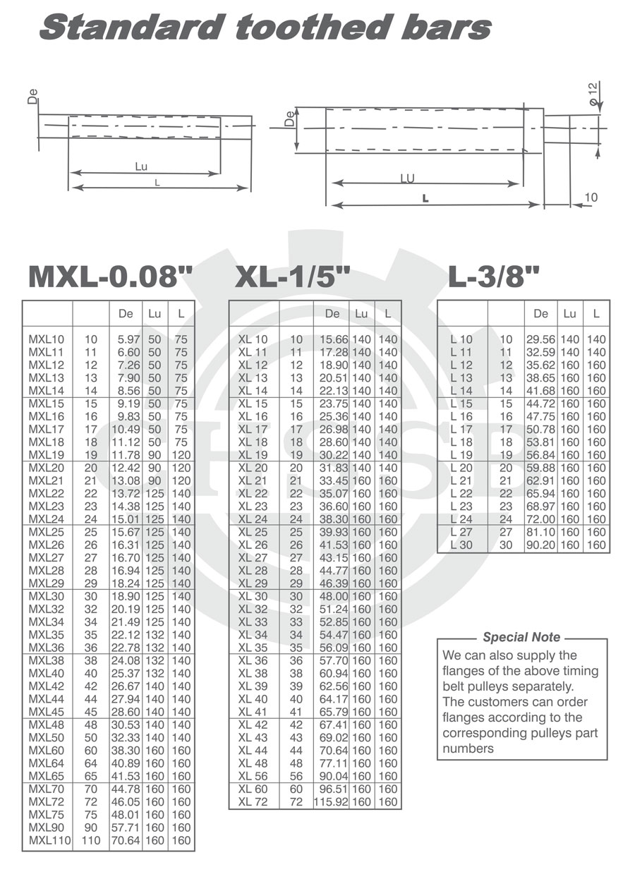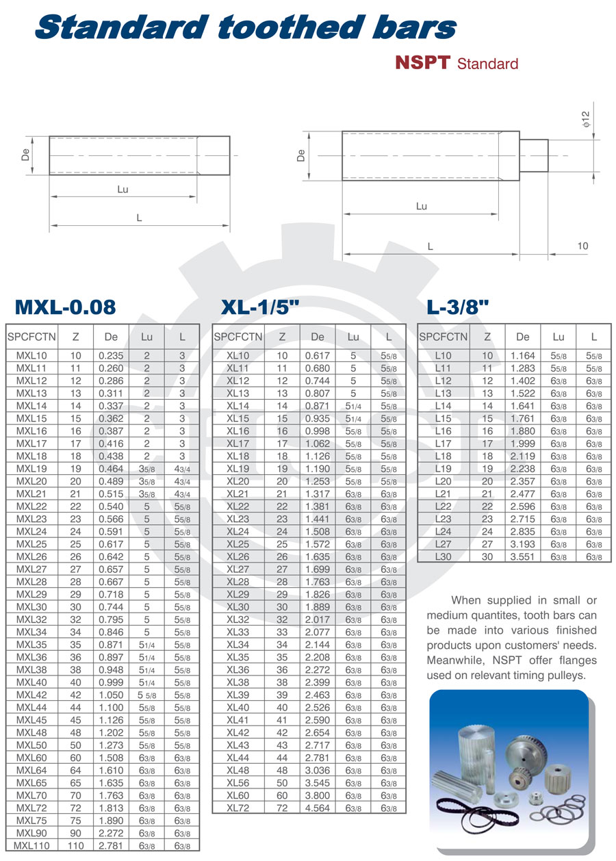 產(chǎn)品范圍: 美標(biāo)/歐標(biāo):(MXL-0.08/XL-1/5/L-3/8) 英制尺寸產(chǎn)品(適用于美標(biāo)市場(chǎng)) 公制尺寸產(chǎn)品(適用于歐標(biāo)市場(chǎng)) 梯形齒齒棒